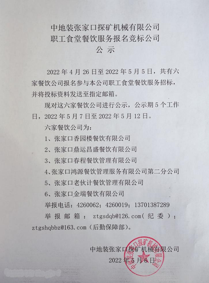 中地裝張家口探礦機(jī)械有限公司職工食堂餐飲服務(wù)報(bào)名競標(biāo)公司公示